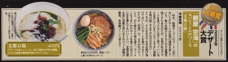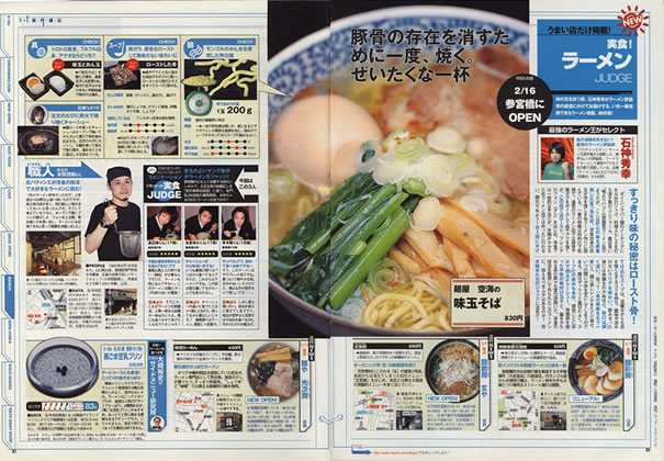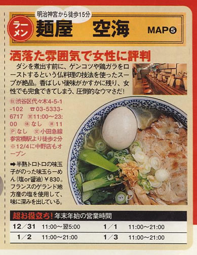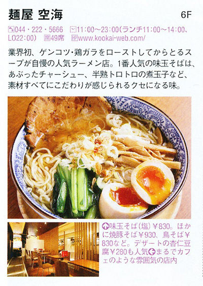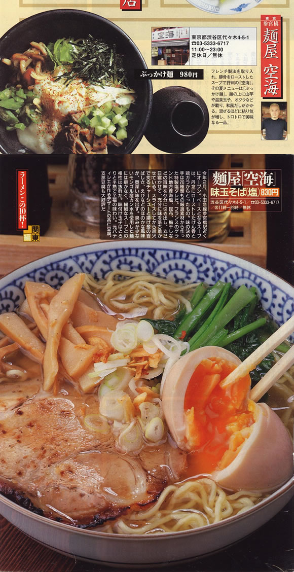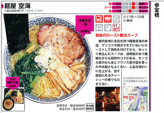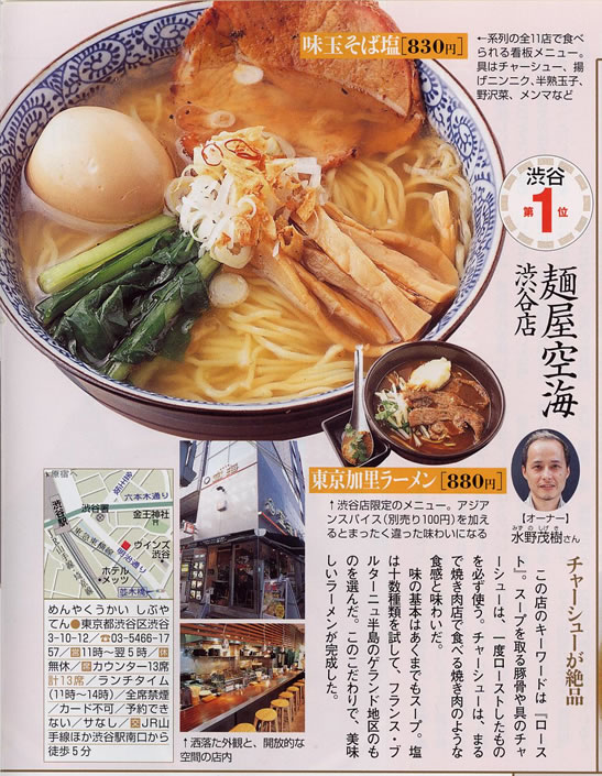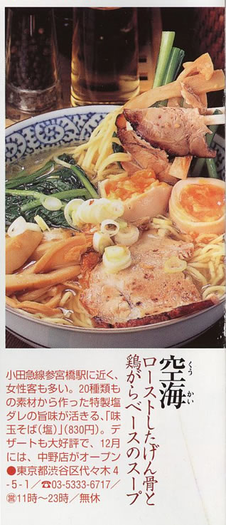 「麺屋 空海」は、2002年渋谷区参宮橋でその産声を上げました。ラーメン業界に今までにない、フランス料理のスープを取る際に用いられる骨をローストしてスープにする「ゲンコツロースト製法」は評判を呼び、またたく間に行列店となり、着実に店舗を増やし現在に至ります。