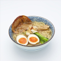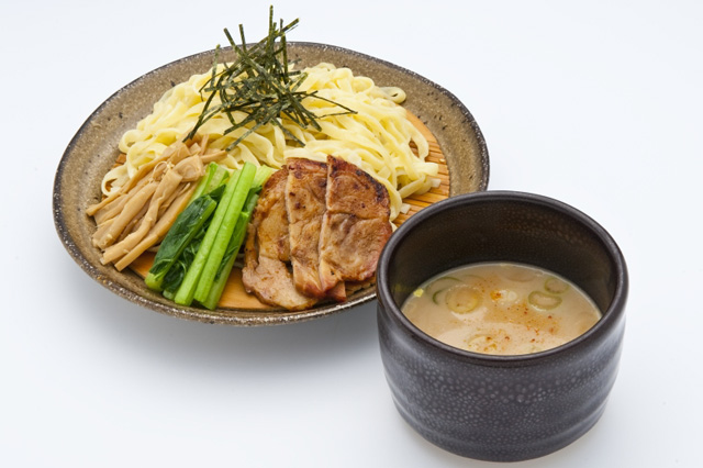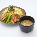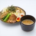 のり・メンマ・白ネギ・江戸菜・炭火焼豚・炙り鶏・味玉・エビわんたんを贅沢にトッピングした、つけ麺の全部のせ! 選べるスープ:醤油・とんこつ