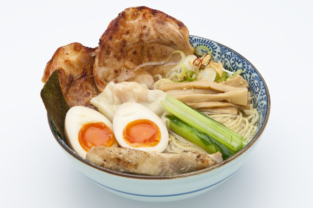 のり・メンマ・白ネギ・江戸菜・炭火焼豚・炙り鶏・味玉・エビわんたんを贅沢にトッピングした特製ラーメンはボリューム満点! 選べるスープ:塩・醤油