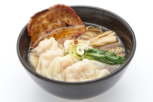 プリプリの特製エビわんたんがたっぷり入ってボリューム満天。 選べるスープ:塩・醤油
